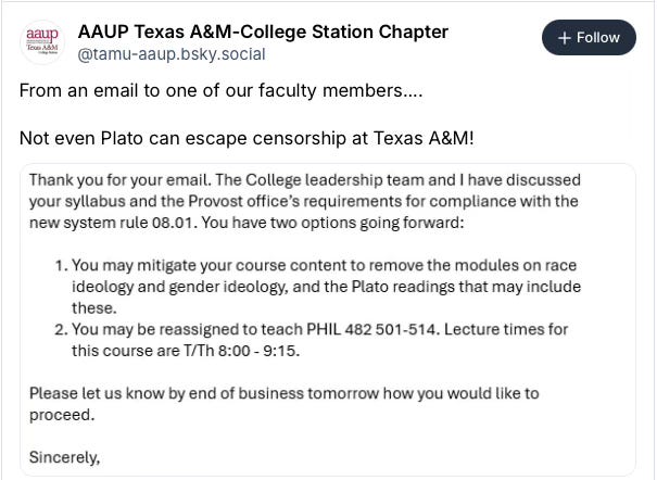 At its heart, a syllabus is a statement of purpose, rooted in the values that will inform the course and class experience. These statements have become contested around politics because they have become another locus for political and ideological actors to attempt to exert control through surveillance and intimidation. These intrusions are reaching truly absurd heights. A social media post from the AAUP chapter at Texas A&M shared a portion of an administrative email to a faculty member instructing that Plato must be removed from the course readings to conform with restrictions on content on “race ideology” and “gender ideology.”